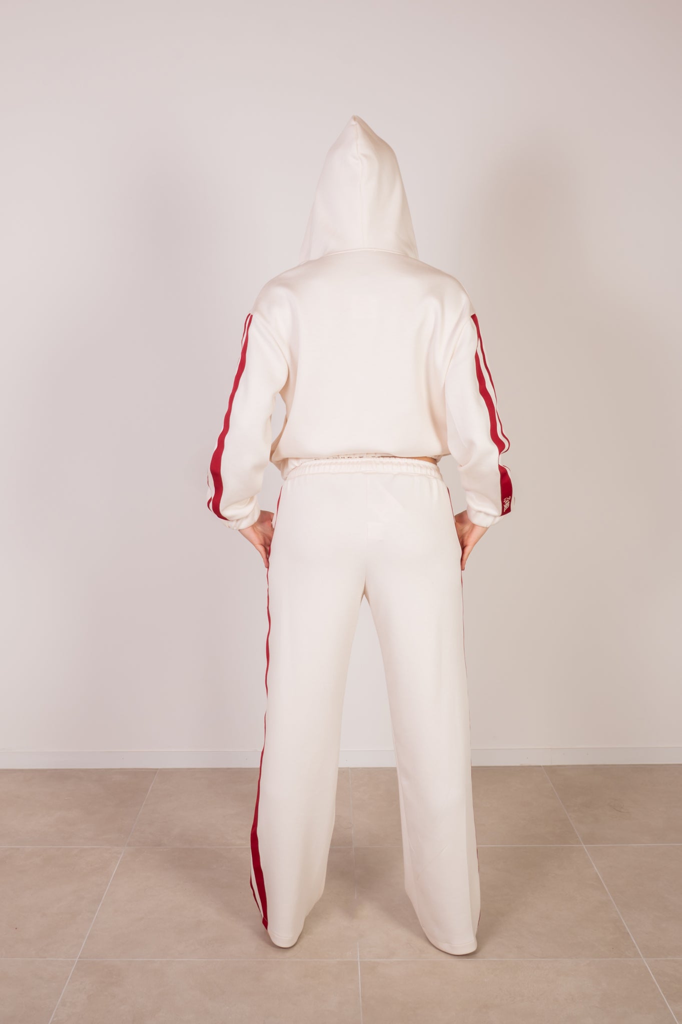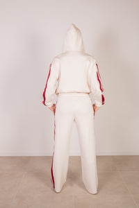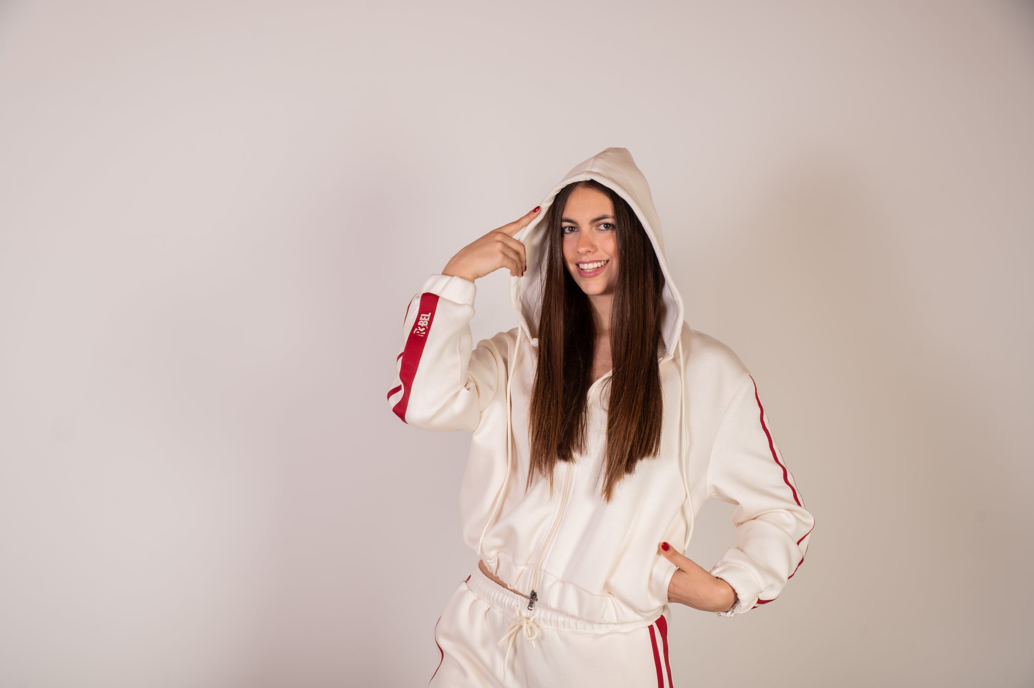 Questo completo ridefinisce lo stile sportivo con un tocco sofisticato. Composto da una felpa con zip e un jogger coordinato, entrambi in una delicata tonalità avorio, si distinguono per i dettagli lineari rossi che percorrono i bordi e si completano con il logo R3bel, rafforzando l’identità del marchio.