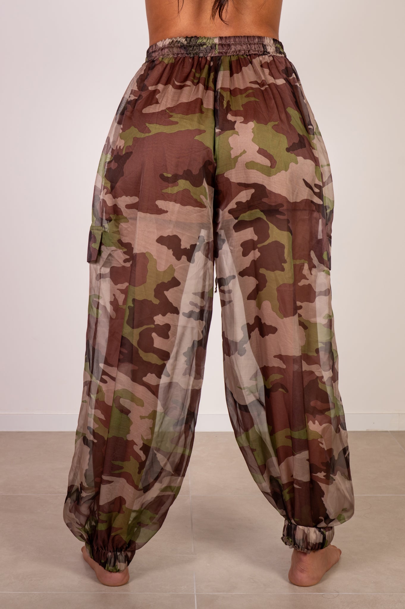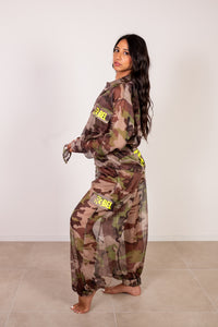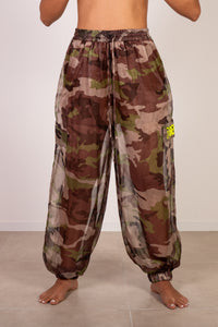 Camouflage semi-trasparente (tipo organza) con logo R3bel giallo sulla tasca