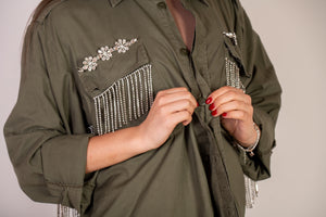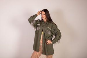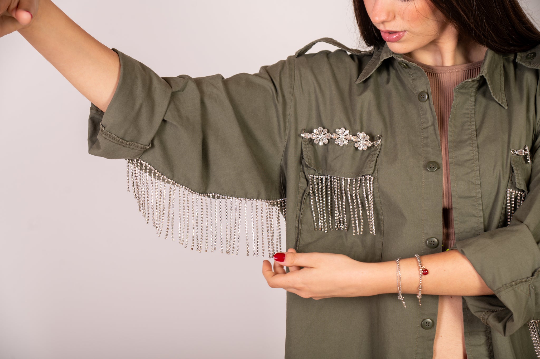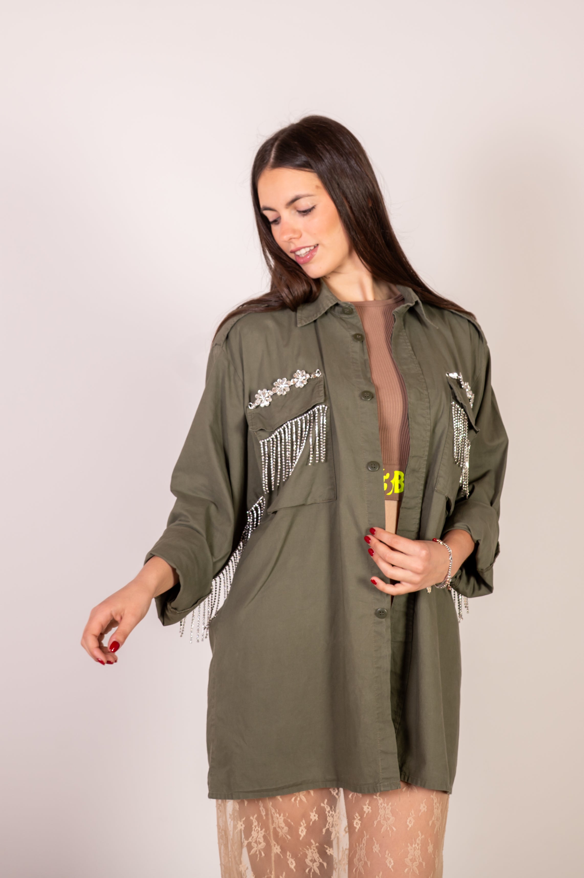 Questa camicia oversize è un capo statement nel mondo sportivo R3bel. Il capo è prodotto dal riciclo di camicie militari originali pertanto ogni capo è unico ed irripetibile. Lo stile severo si unisce ai ricami artigianali fatti con pietre sulle tasche e frange di brillanti strass sulle maniche, creando un capo davvero unico. Ideale da indossare prima o dopo l’allenamento o come strato leggero per elevare ogni outfit.