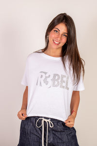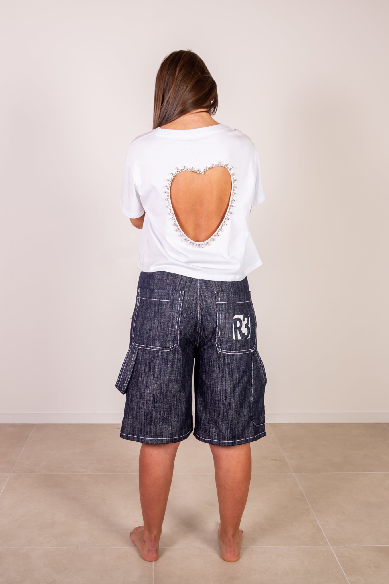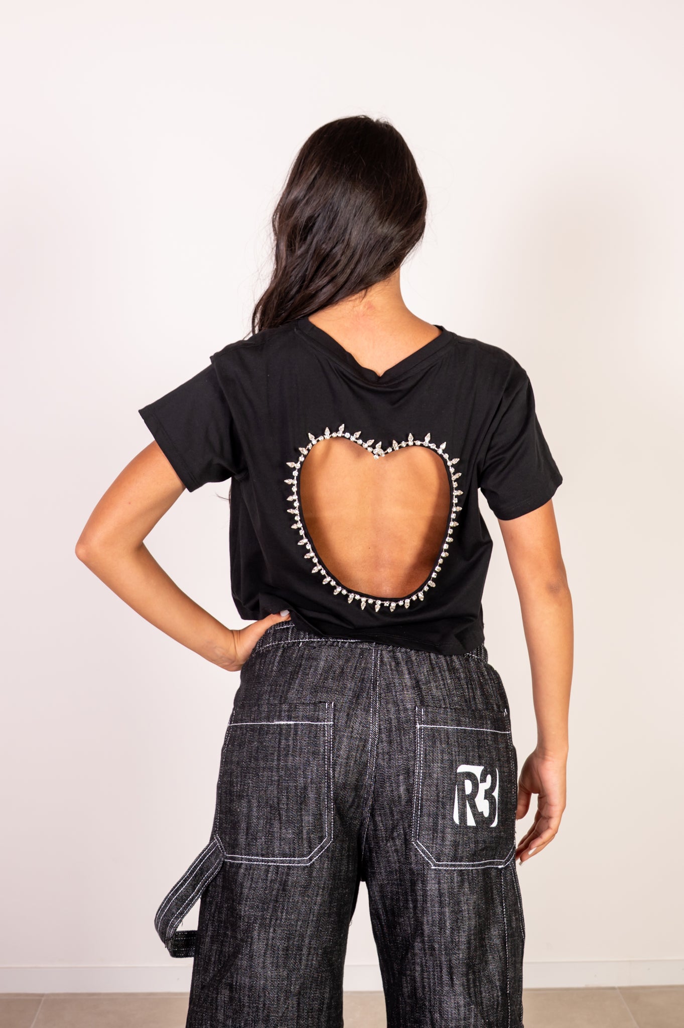 La t-shirt R3bel unisce il classico a un tocco speciale. Con il logo argentato e brillante sul davanti, presenta, sul retro, un foro a forma di cuore con applicazione di strass cuciti a mano, questo la rende una pezzo unico. Ideale per un look casual ma ricco di personalità, è disponibile in bianco e nero.